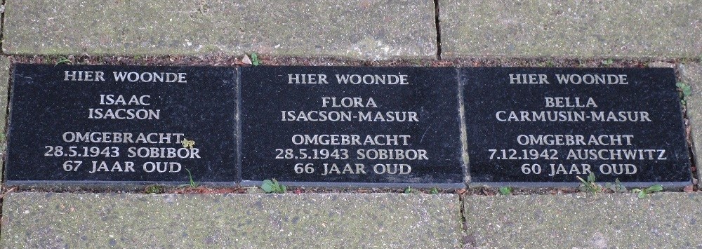 Holocaustslachtoffers. Hun kinderen Betty, Herbert, Rita, Max, Louis en Fella hebben allen de oorlog overleefd. Betty en Fella waren met hun gezinnen al in september 1939 naar Amerika vertrokken. Herbert overleefde het concentratiekamp Bergen-Belsen. Ook zijn vrouw zat in Bergen-Belsen. Zij kwam begin april 1945 om na een beschieting door geallieerden, die dit gedeelte van het kamp voor Duitse legerbarakken aanzag. Flora’s zus Bella en Isaac’s zus Anna zijn omgebracht, Bella’s dochter Frieda en haar man slaagden er in tijdig te emigreren en overleefden de oorlog.