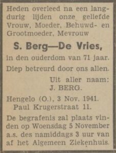 Na haar huwelijk met Jozua Berg ging het gezin ook in Losser wonen, waar hun drie kinderen zijn geboren. Later woonden ze aan de Langelermaatweg 217 te Hengelo, waar Jozua slager was. Tijdens de oorlog woonden ze waarschijnlijk aan de Paul Krugerstraat 11. Saartje is hier in november 1941 na een langdurige ziekte overleden.